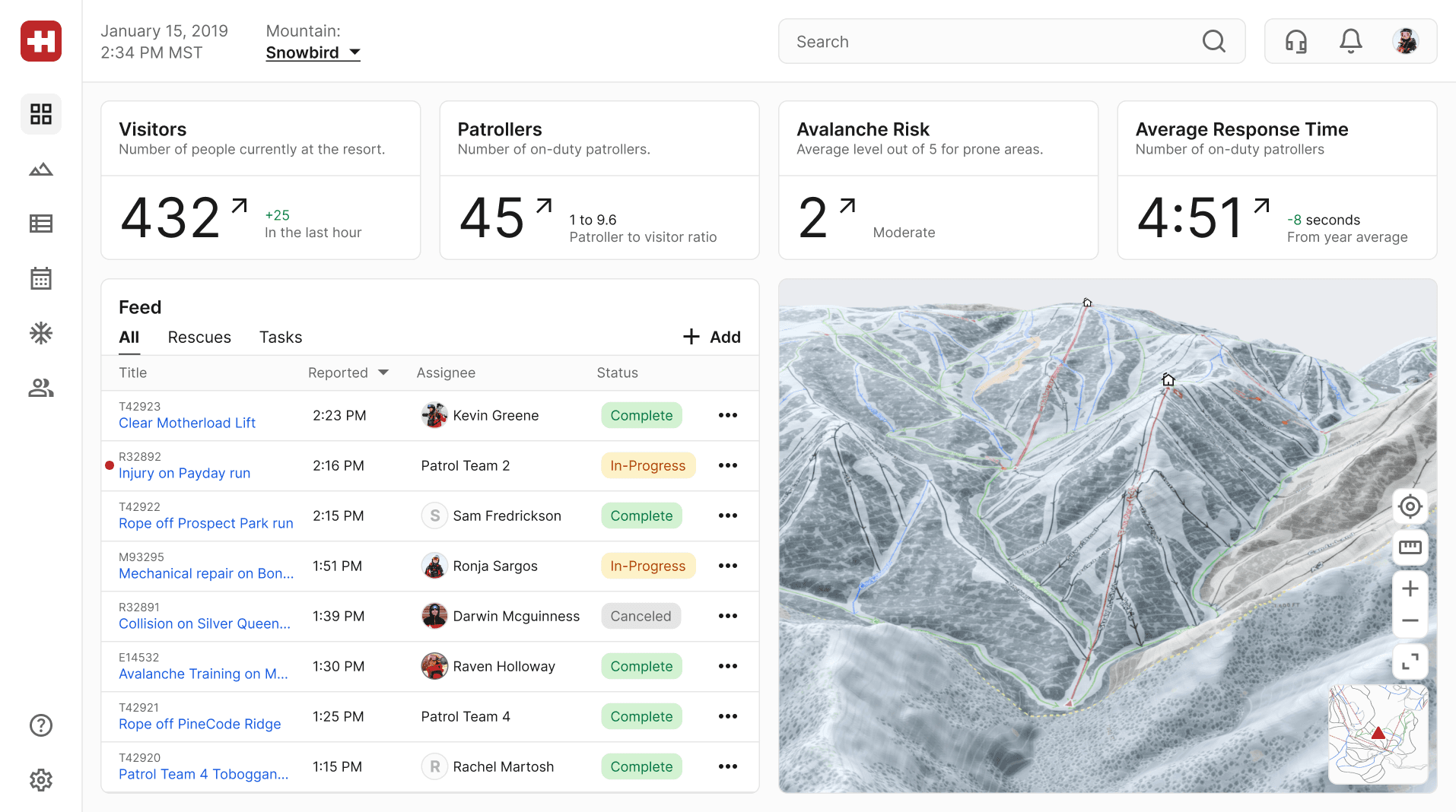 The interactive three-dimensional map displays precise mountain updates, improving dispatchers' ability to move active patrollers around the mountain efficiently.