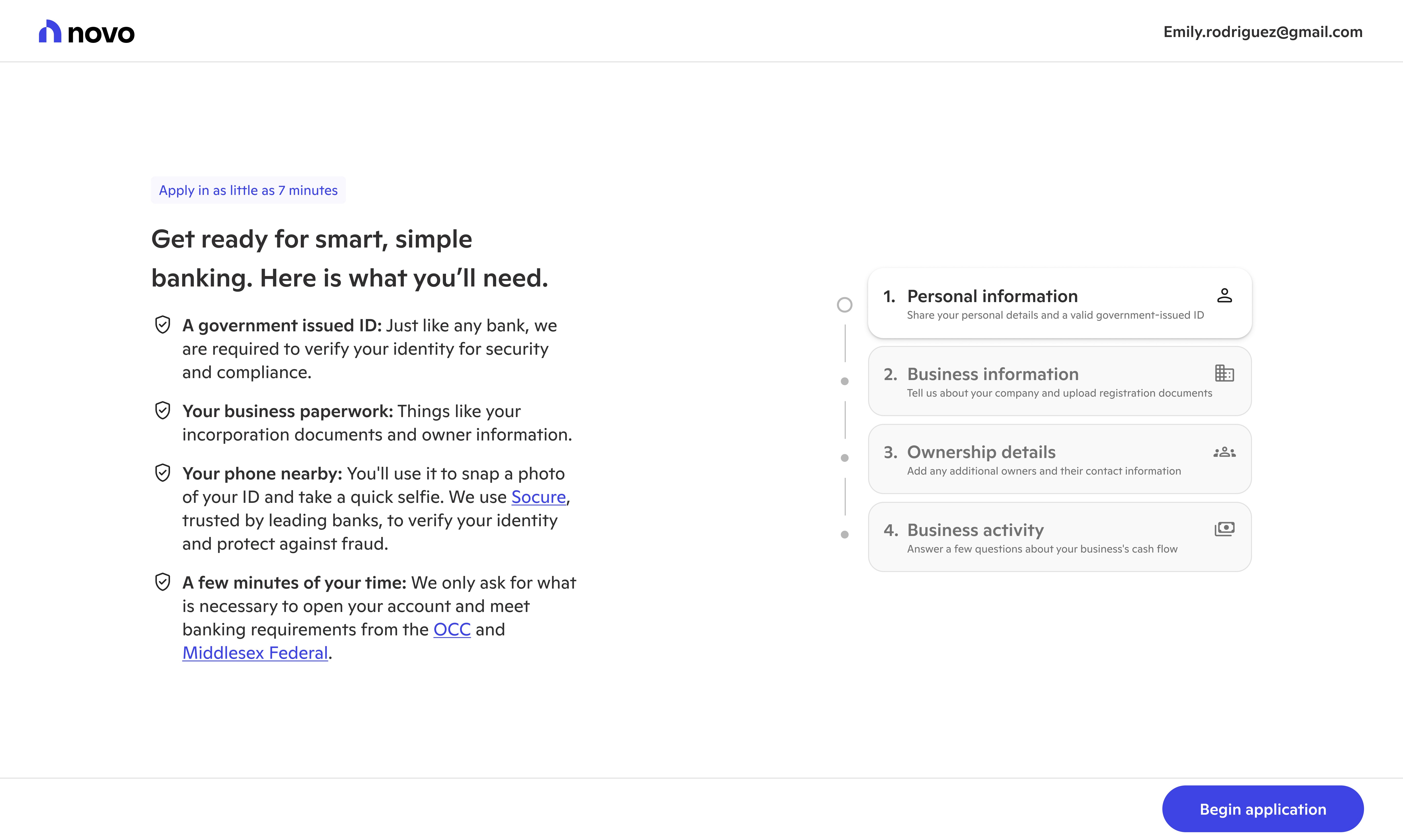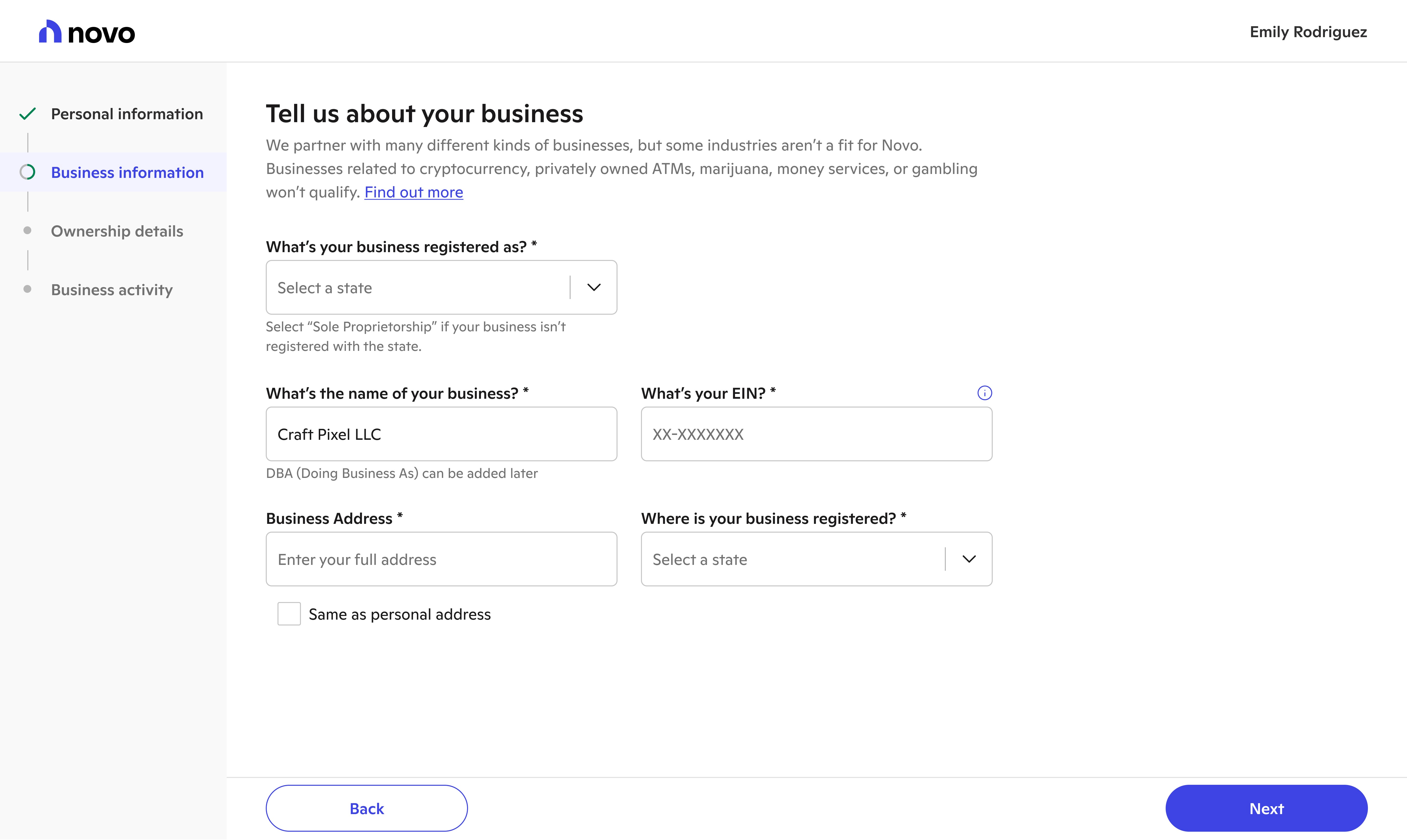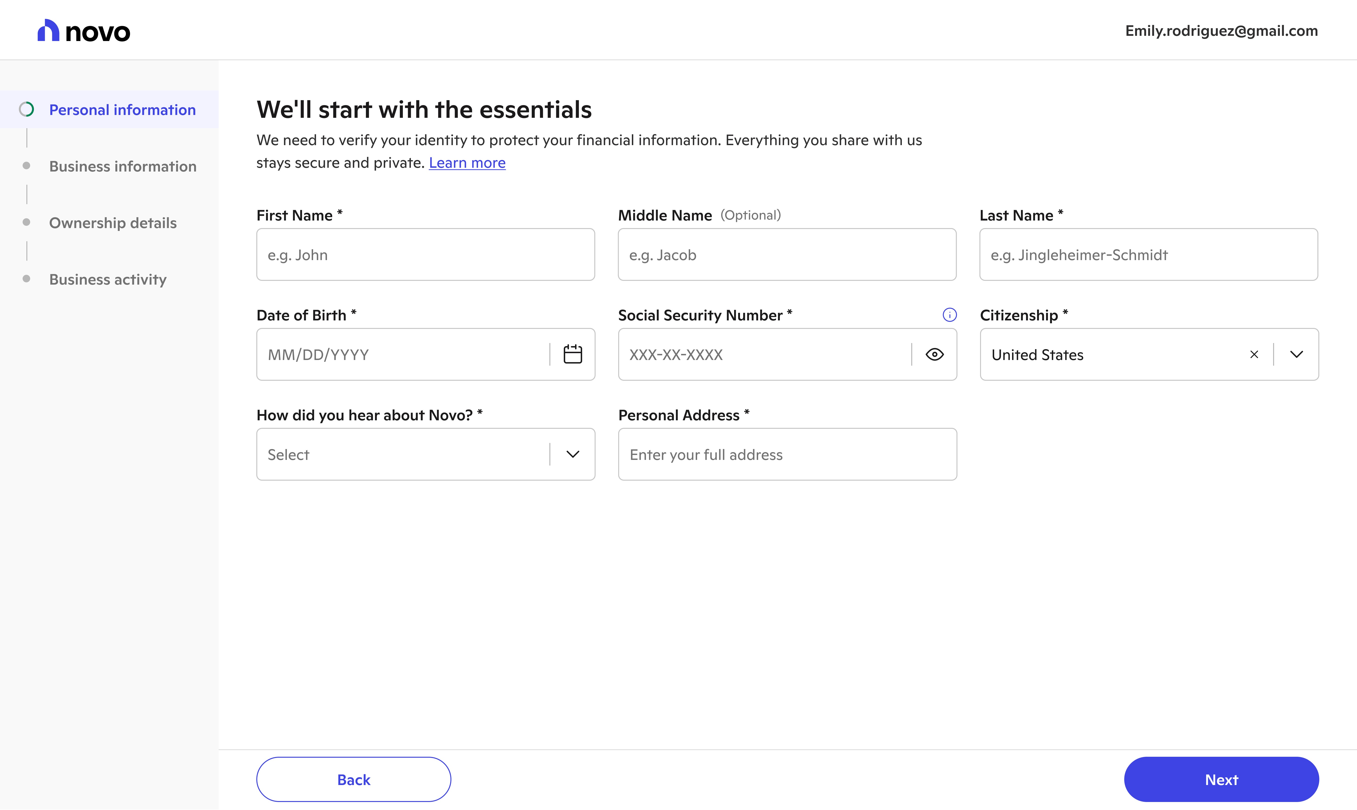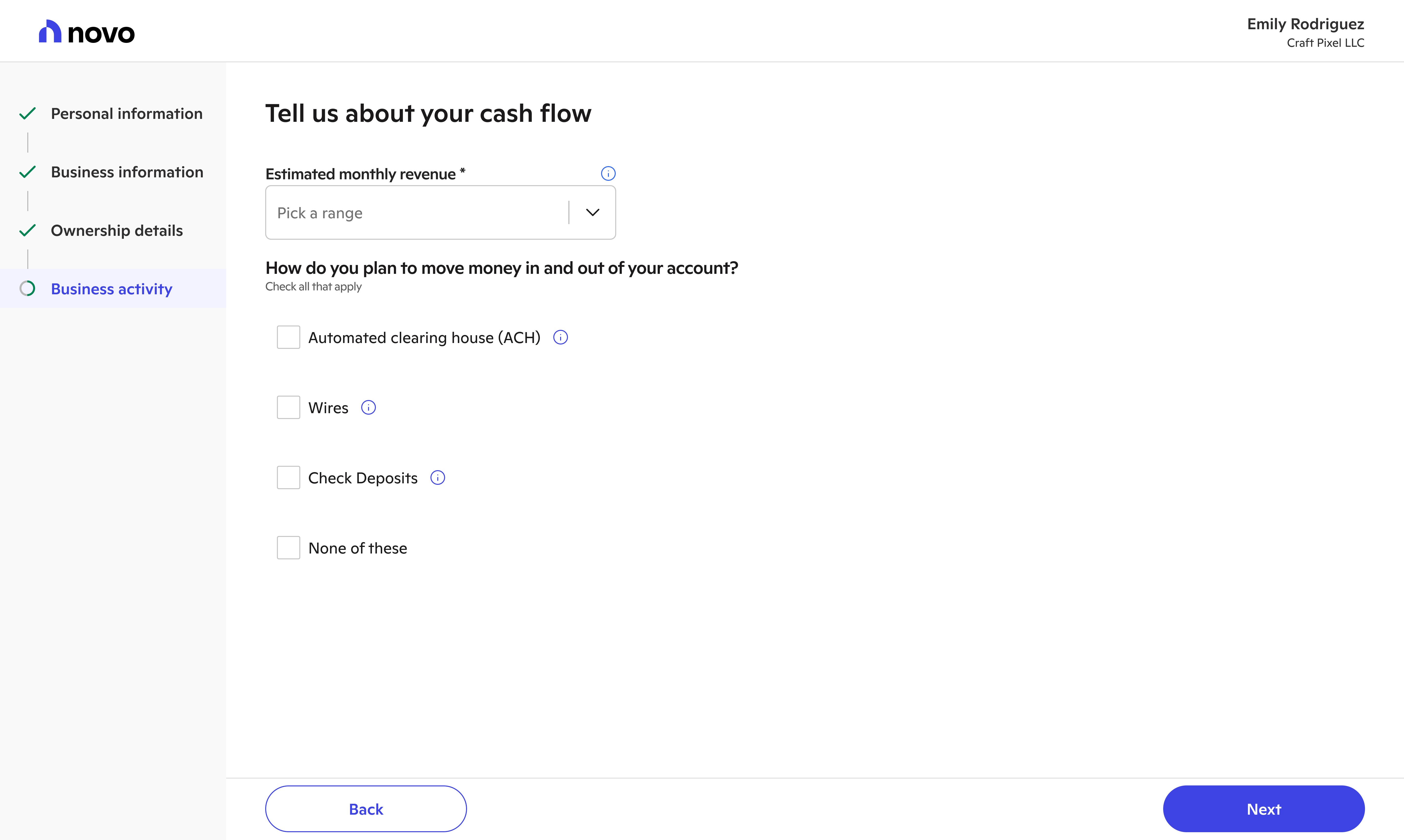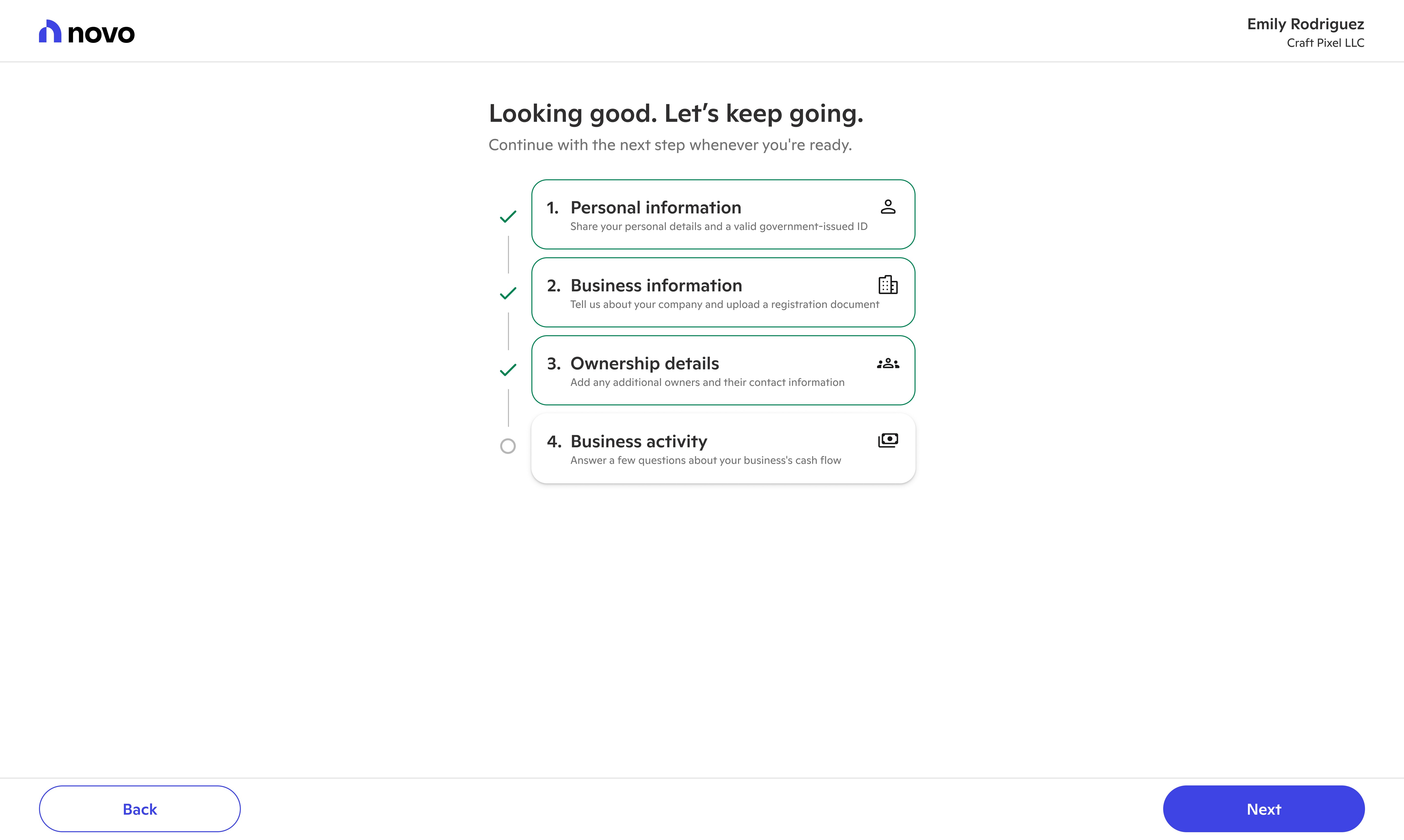 Novo provides banking tools for small businesses. The first stop on their journey to better banking involves signing up and applying for a Novo checking account. With new systems, processes, and user insights, we evolved new user onboarding into a welcoming experience.
