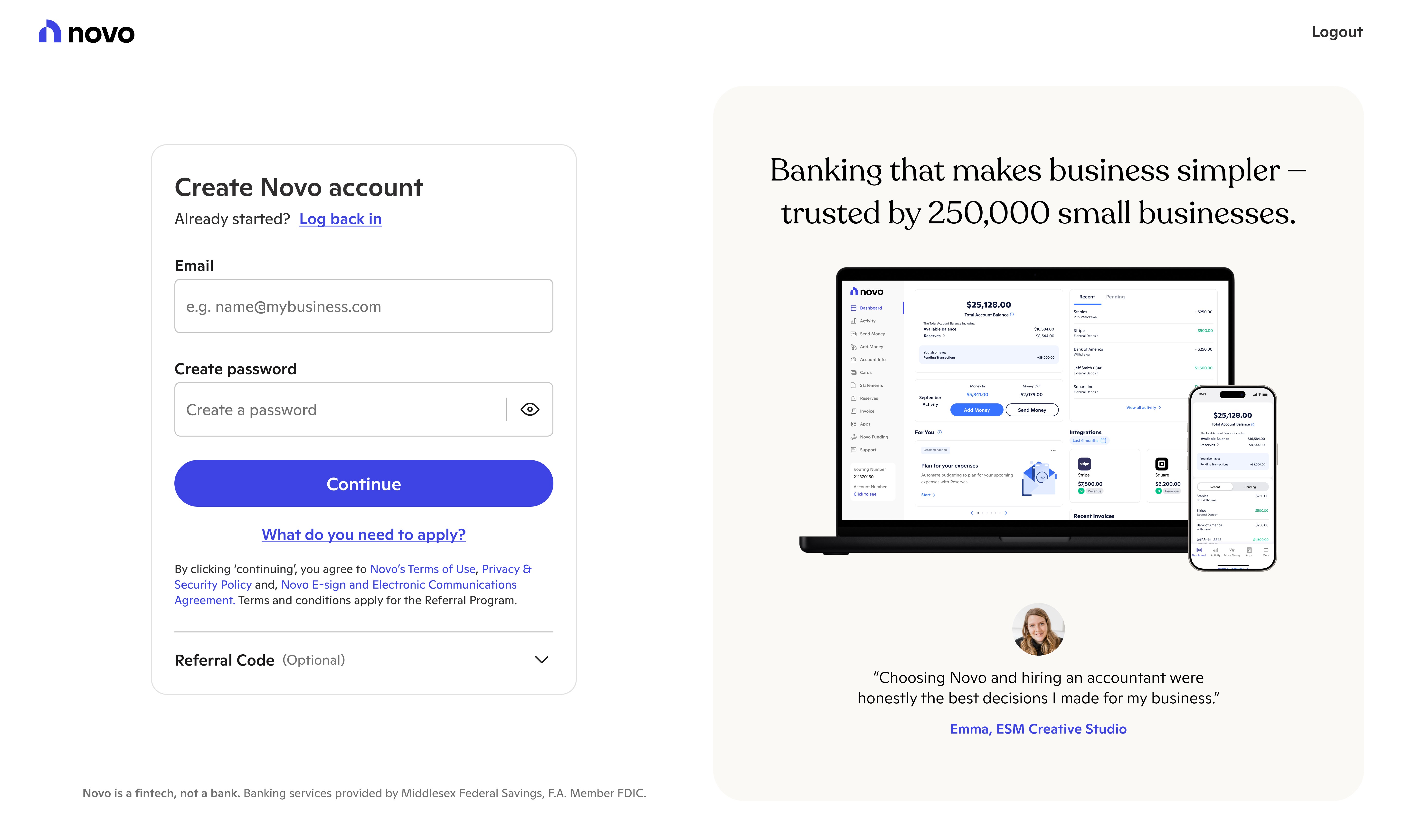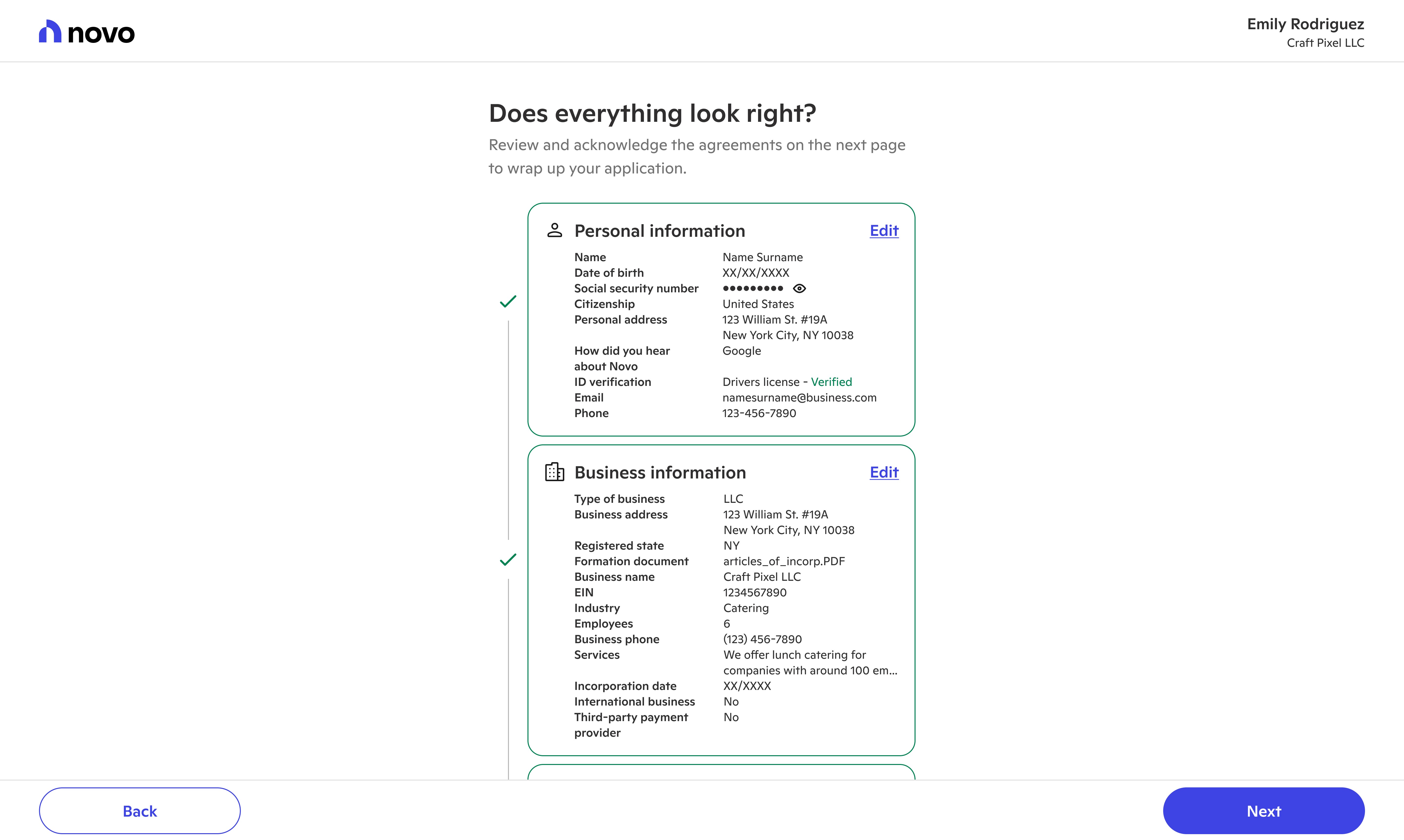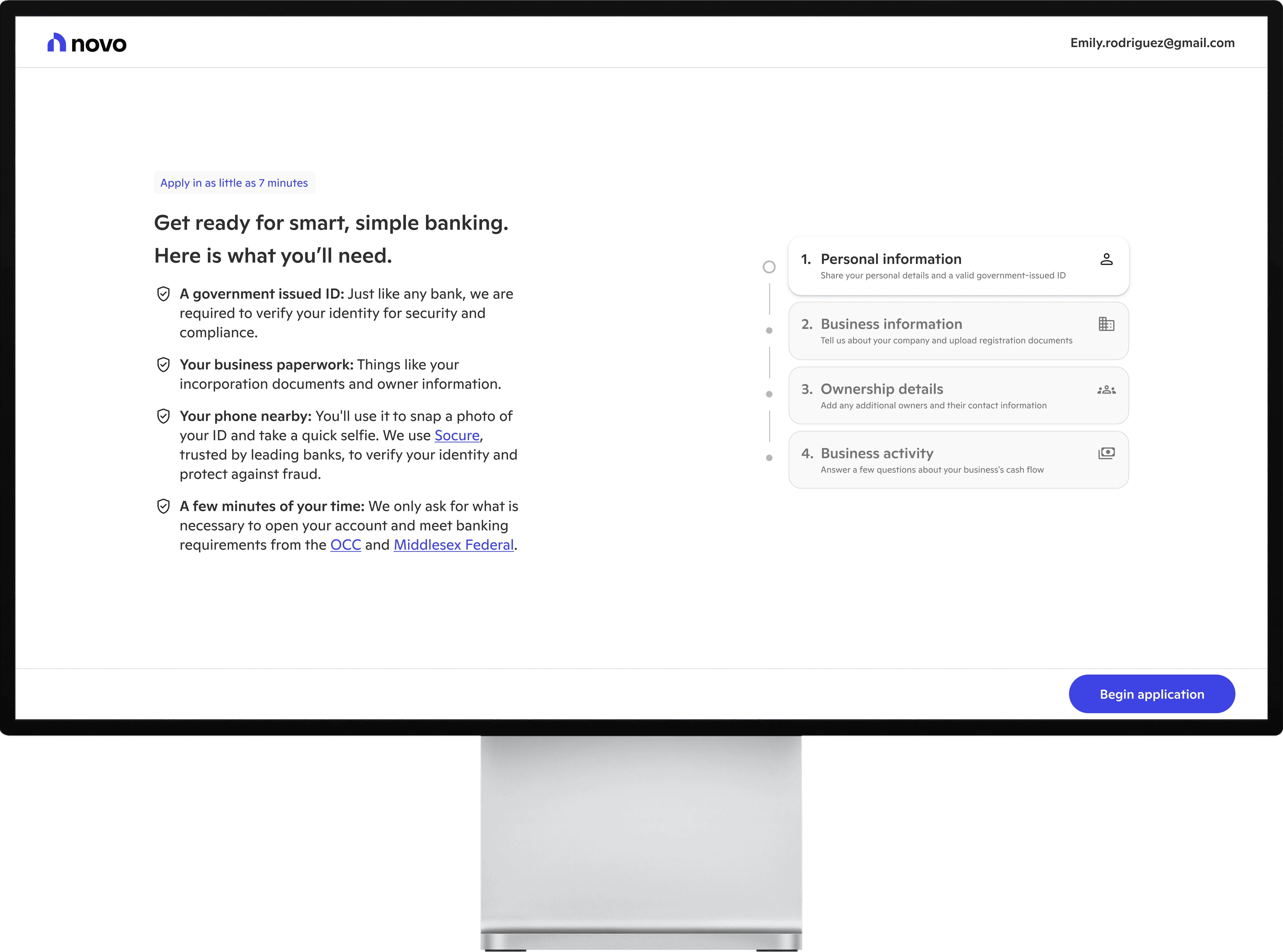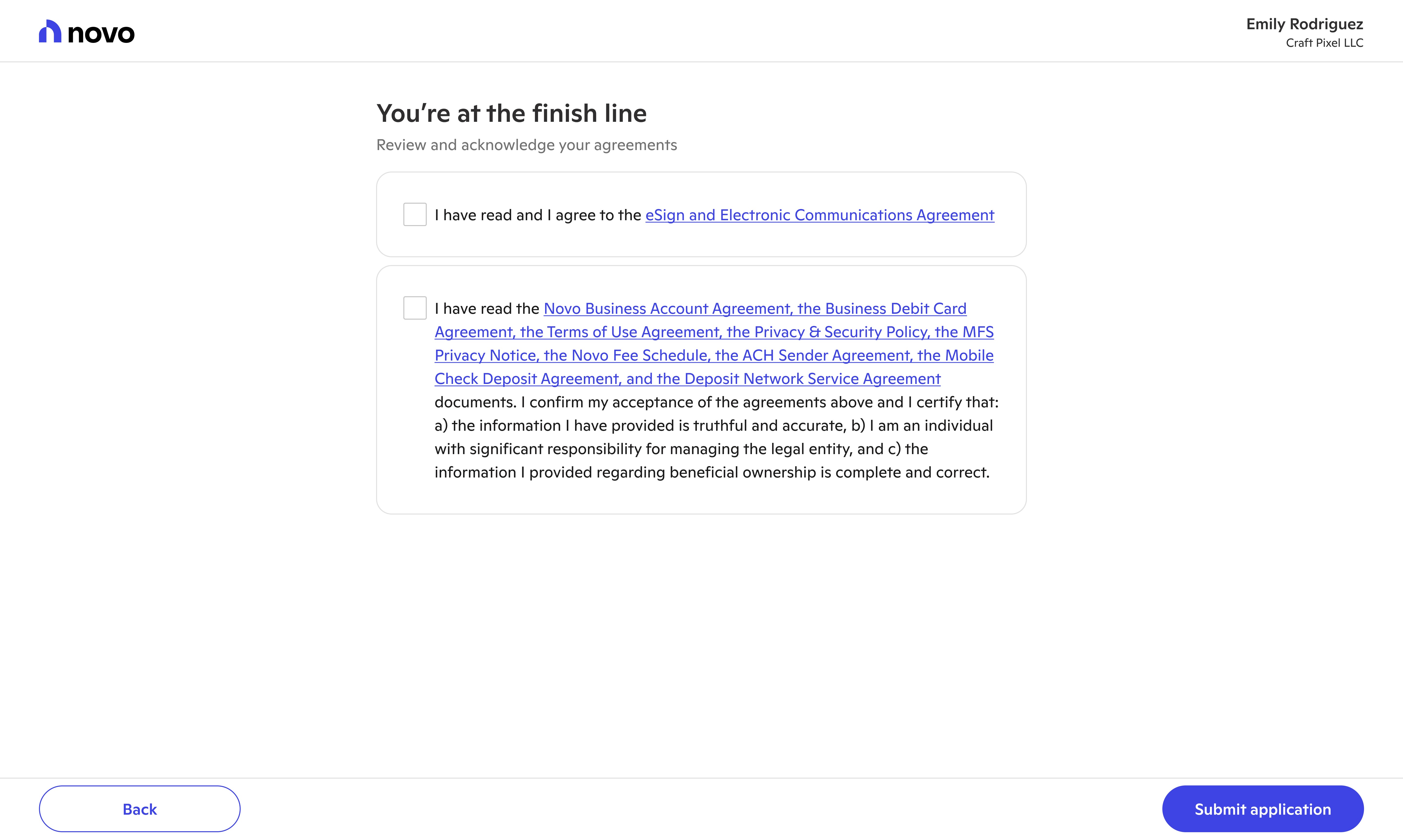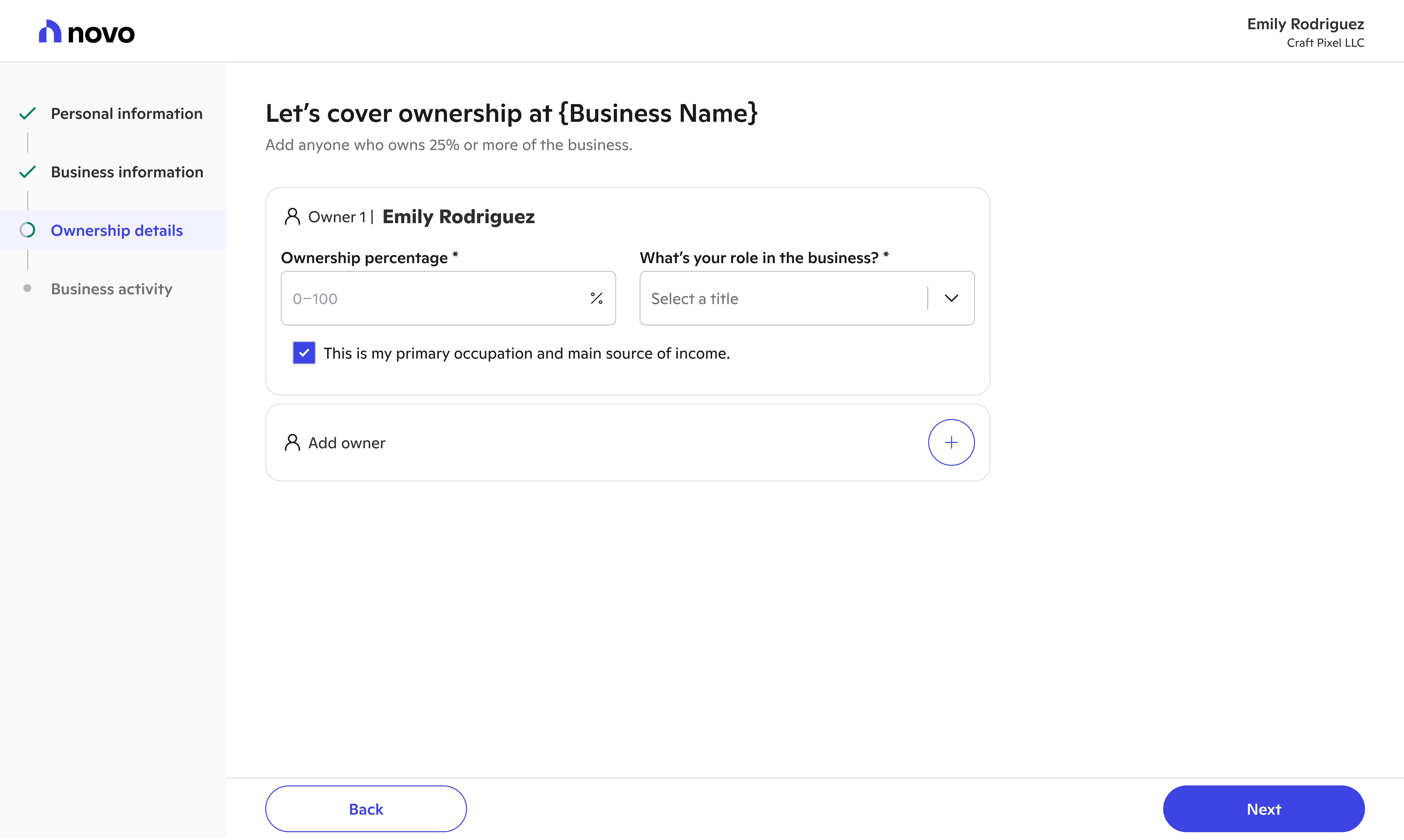 Novo provides banking tools for small businesses. The first stop on their journey to better banking involves signing up and applying for a Novo checking account. With new systems, processes, and user insights, we evolved new user onboarding into a welcoming experience.